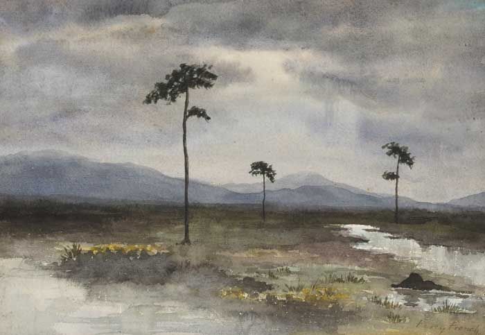 BOGLAND LANDSCAPE WITH TREES AND MOUNTAINS BEYOND