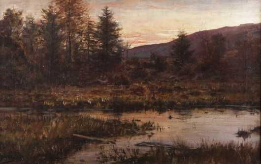 | early dawn landscape with a marsh in the foreground, with trees and hills in the back | |