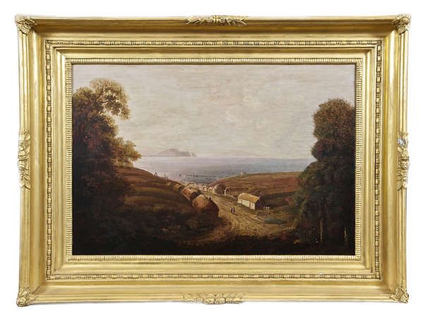 | A view of Ireland's Eye, Howth Harbour, with cottages and figures in the foreground | |