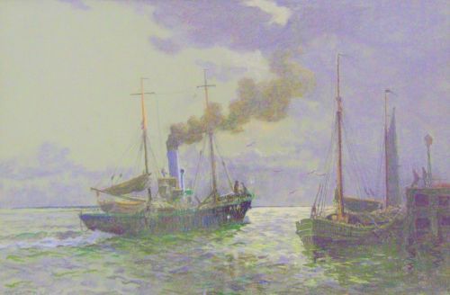 | A moonlit seascape with steam boat and sailing vessels at a jetty | |