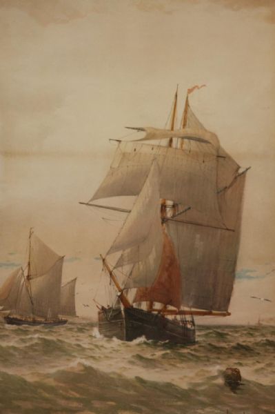 | Sailing vessels at sea with steam ship in the background | |