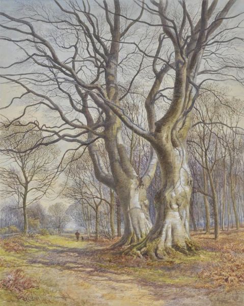Woodland landscape with gamekeeper and dog on path