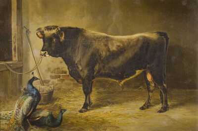 | "Rival Beauties," stable scene with bull and peacocks | |