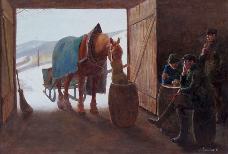 | Rast im Winter an einer Scheune mit Pferdeschlitten und Figurenstaffage. | |