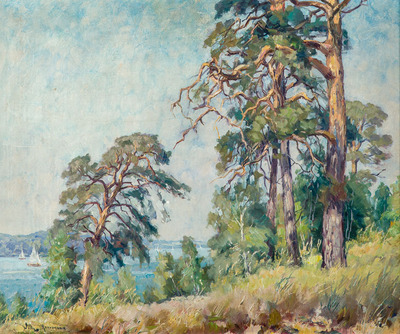 | Wannseefenster with sailboats, in the foreground bank with large pines | |