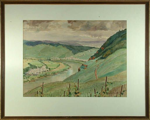 | Frühsommerlicher Blick über eine Moselschleife, im Vordergrund Rebhänge, am Flussufer zwei kleine Dörfer | |