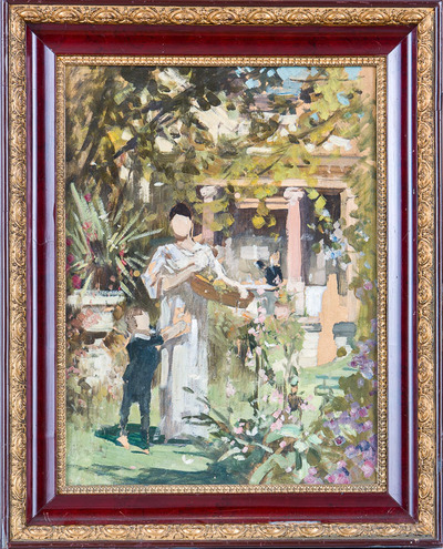Mutter und Knabe im Garten einer Stadtvilla. Studie