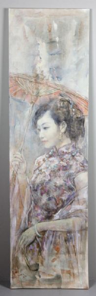 | portrait of a young Chinese woman wearing light shawl, bead necklace, holding orange parasol in other hand | |