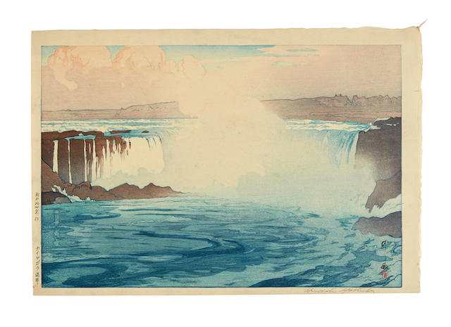 Comprising two oban yoko-e and two oban tate-e prints; the first entitled Naiagara bakufu (Niagara Falls), from the series The United States, dated 1925; Tsutsuji no niwa (Azalea Garden) and Harusame (Sprint Rain), from the series Sakura hachidai (Ei | |