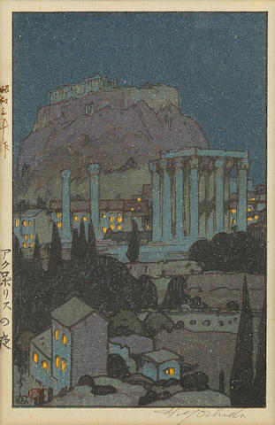 A small woodblock print (framed) entitled Akuroporisu no yoru (Moon Light Acropolis), dated 1928, signed Yoshida, signed in pencil H. Yoshida | |