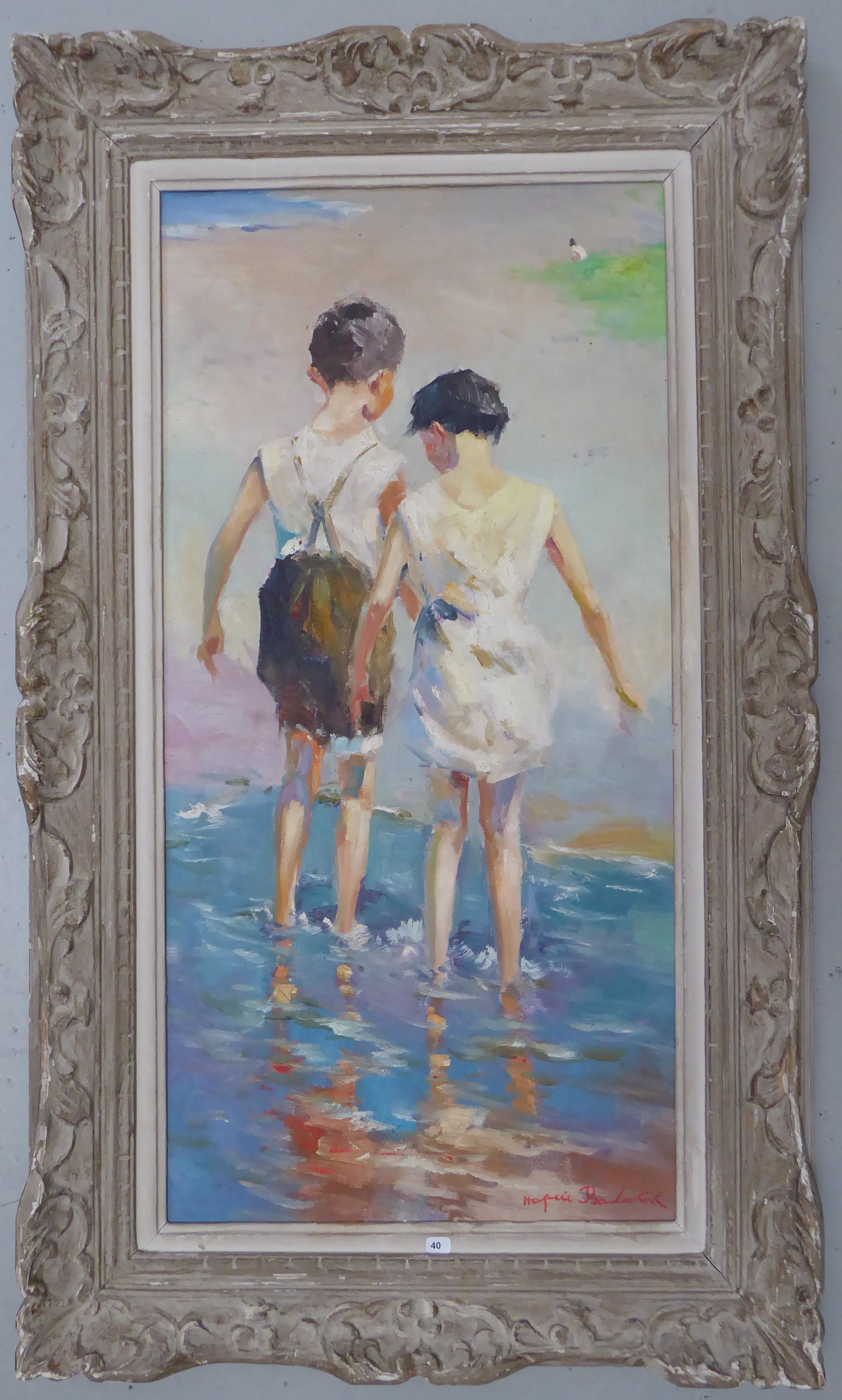 | Deux enfants de dos les pieds dans l’eau | |