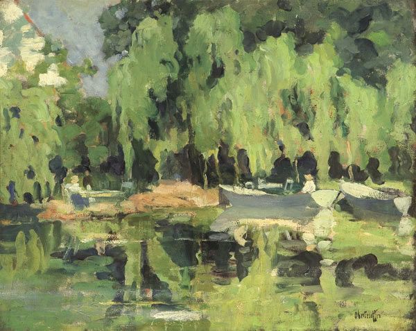 George Oberteuffer ( 1878 - 1940 ) was an American painter. George Oberteuffer s works have been put up for auction numerous times, with realized prices surpassing estimated prices, varying from 11353 USD for The Farm in Winter in 2004 to 20000 USD for BOOTHBAY HARBOR YACHT CLUB, MAINE in 2007 , based on the size and medium of the artwork.
