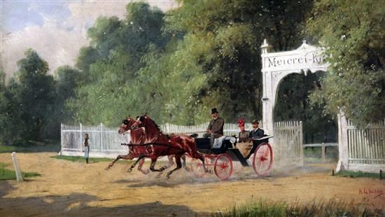 Heinrich Gottfried Wilda ( 1862 - 1911 ) was an Austrian painter. Heinrich Gottfried Wilda s works have been put up for auction numerous times, with realized prices surpassing estimated prices, varying from 351.4 USD for A carriage driving through the park in 2009 to 2914.65 USD for 3 CARRIAGE SCENES in 2011 , based on the size and medium of the artwork.