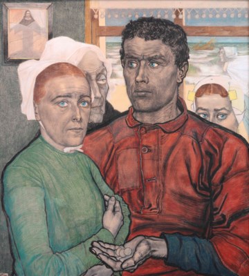 Jan Toorop ( 1858 - 1928 ) was a Dutch painter. Jan Toorop s works have been put up for auction numerous times, with realized prices surpassing estimated prices, varying from 2122.64 USD for Portrait of a girl in 2015 to 333225.78 USD for Faith and Reward in 2018 , based on the size and medium of the artwork.