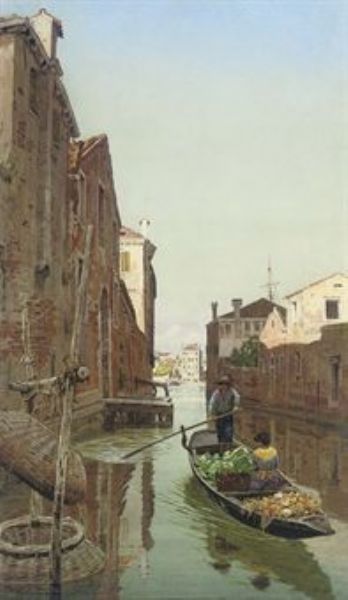 T Hampson Jones ( 1846 - 1916 ) was a British painter. T Hampson Jones s works have been put up for auction numerous times, with realized prices surpassing estimated prices, varying from 184.04 USD for Scene with a Drover herding Cattle before a Village Pub in 2007 to 892.64 USD for A gondola loaded with vegetables on a Venetian backwater in 2009 , based on the size and medium of the artwork.